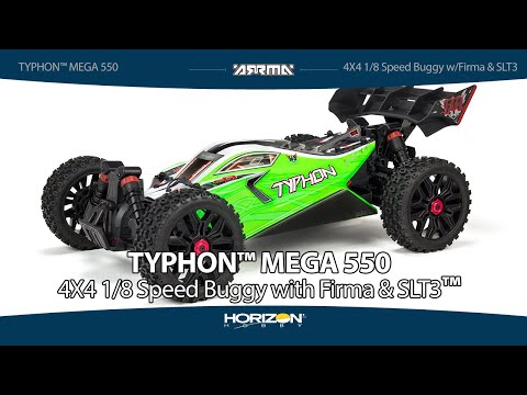 Blast into huge, high-speed RC buggy action with the 1/8 scale, ready-to-run ARRMA TYPHON 4X4 MEGA 550 Speed Buggy. This fast RC buggy from the ARRMA design team arrives equipped straight out of the box for amplified speeds and extreme, all-terrain durability. The ARRMA TYPHON 4X4 MEGA 550 is more than just basher tough. Precision aluminum, durable steel and composite materials come together in a faster, tougher ARRMA RC buggy design that has a huge arsenal of advantages — such as a full-time 4WD transmission, low center of gravity, wide arms, high downforce wing, and narrow wheels and tires — for sending it down race tracks, trails, muddy courses, skate parks and more with complete confidence. If you’re a first time remote control buggy basher, the included 3-channel Spektrum transmitter lets you set throttle limits at 50% or 75% until you’re ready to unleash the full speed potential. The ARRMA team also simplifies adjustments and maintenance with an innovative modular chassis that puts every component in fast, easy reach. Tuning your RC buggy for top performance on any track has never been so simple. No matter where you bash the ARRMA TYPHON 4X4 MEGA 550, its high chassis sides, close-fitting body, and rugged front and rear bumpers mount an impressive defense against dirt, debris, and impact damage. The supplied 7C NiMH battery offers plenty of power and run time, but you can also drop in a 2S LiPo and experience even greater extremes of RC buggy fun