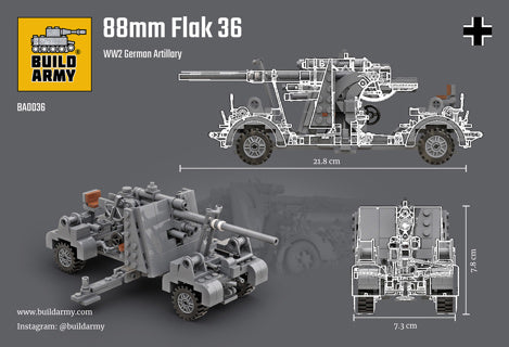 Recreate the legendary 88mm Flak 36 Artillery, one of the most feared anti-aircraft and anti-tank guns of WW2. Known for its versatility and devastating firepower, the Flak 36 was a crucial asset on the battlefield for the German army, engaging both enemy aircraft and armoured vehicles with formidable firepower. This 1:33 scale model faithfully captures the complex mechanics of the real gun, featuring detailed elevation and traverse controls, realistic sighting instruments, and the iconic cruciform base that allowed for rapid deployment and stability during firing.