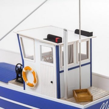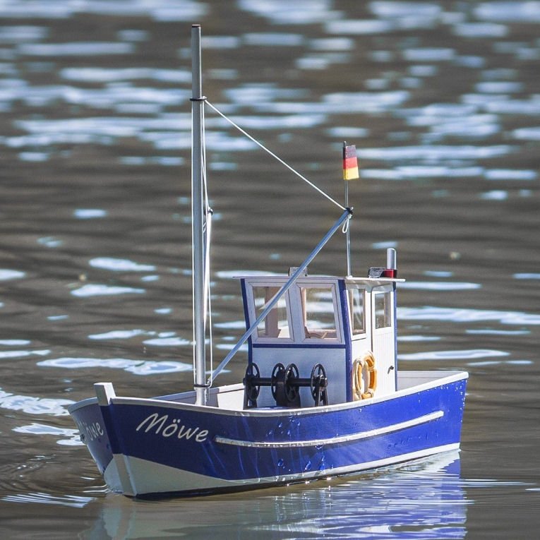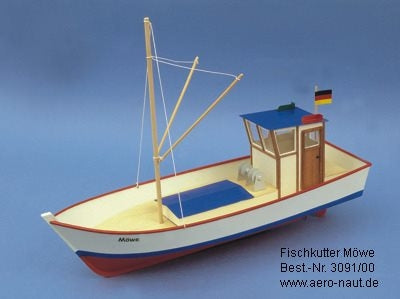 The Mowe is based on a typical North Sea cutter, and is an ideal all-wood model for the beginner to the hobby. It is also suitable for group work, e.g. as a school technology project. All parts are supplied die-cut or sawn to shape and virtually ready to fit; assembly is absolutely straightforward and can be completed in a very short time using only simple tools (scissors, drill, clothes pegs, screwdriver, pins and adhesive tape). The deck serves as a building jig: the bulkheads are erected on it and glued to the thin plywood hull sides