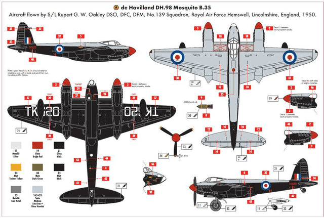 - Marking options for 3 distinctive new schemes which tell the story of the Mosquito’s changing roles in late World War 2 and into the post-war era- including the colourful TT.35 target towing variant “TA719” which survived into preservation.