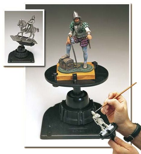 The professional answer to the need of stability while assembling and colouring your models. The system consists of a rotating support, a handle, two interchangeable support bases and eight small fixing plates.