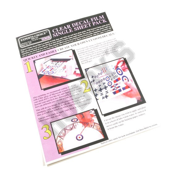 With Experts Choice plain decal film you can use your own colour ink jet or laser printer to make home made decals. You can also use a colour photocopier to reproduce any decal of your choice. This material allows you to use existing artwork from books, magazines, computer clip art or you own original art to create any decal.