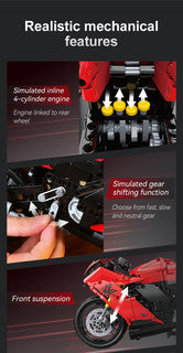 Officially licensed by Suzuki, this CaDA Bricks model is a 25th Anniversary Edition of the Suzuki Hayabusa sports motorcycle made up of 1,043 pieces in large 1:6 scale. It has a classic red and black colour scheme with printed pieces (no stickers), streamlined body shape, front windscreen, silver colour exhaust pipes, and narrow front and wide rear tyres. The wheels are complete with shock absorbers, while the front wheels are linked to the handlebars to allow for manual steering. To add even more detail to the model, three shiftable gears are included and can be operated through the foot pedal.