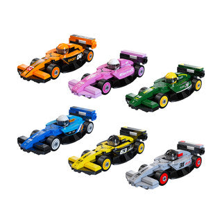 A fun self-build brick model of a modern Formula One style racing car with striking pink and black colour scheme. It features detailed exterior design with manual forwards/backwards movement, making it ideal for play and display alike.