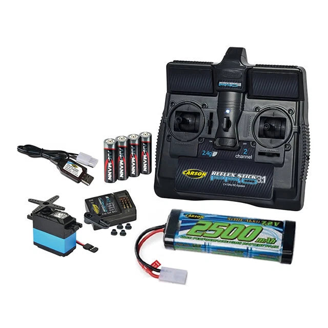 Carson Stick Pro 3.1 4-Channel 2.4GHz Surface Stick Radio Transmitter Set with 4 Channel Receiver, Steering Servo, 4x AA Batteries and 7.2v 2500 mAh Nimh Battery with USB Charger.