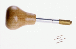 Made with a rugged wood handle formed to comfortably fit the hand. A hollow compartment in the metal shank provides convenient storage for the four insertion pins. Both shank and punch are nickel plated. Overall length is approximately 4-5/8". Instructions in package.