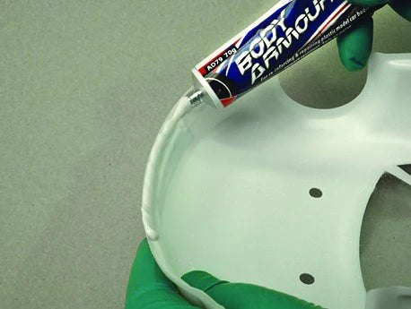 Deluxe Materials Body Armour is a highly flexible polymer adhesive specially designed for reinforcing & repairing model car bodies subject to the arduous conditions of model car competition. Its dries flexible making it ideal for protecting & repairing splits in model car bodies. It bonds most car body plastics including Lexan, polycarbonate & styrene & will not attack most common model car paints.