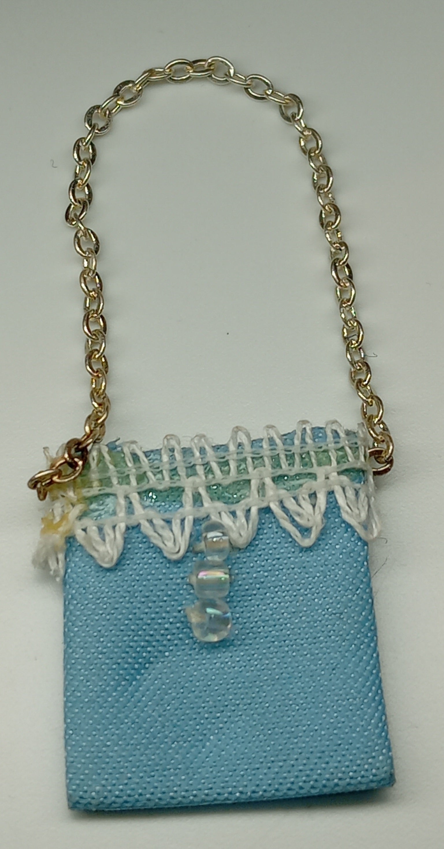 Pretty pale blue evening bag with white lace edging and silver coloured chain strap for 1:12 Dolls House by Dolls House emporium 6355