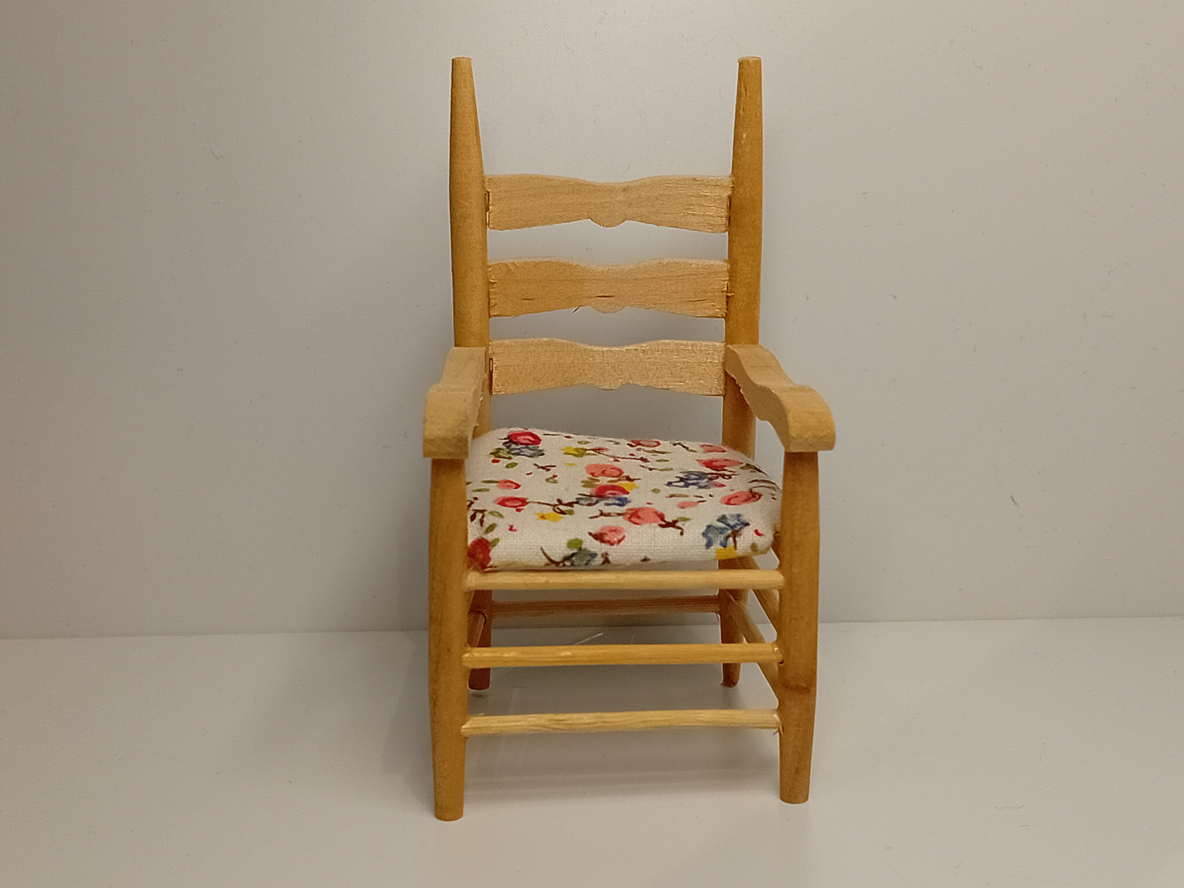 Dolls House 1:12 plain wooden armchair ready for finishing in your own colour scheme. Comes complete with floral seat cushion.