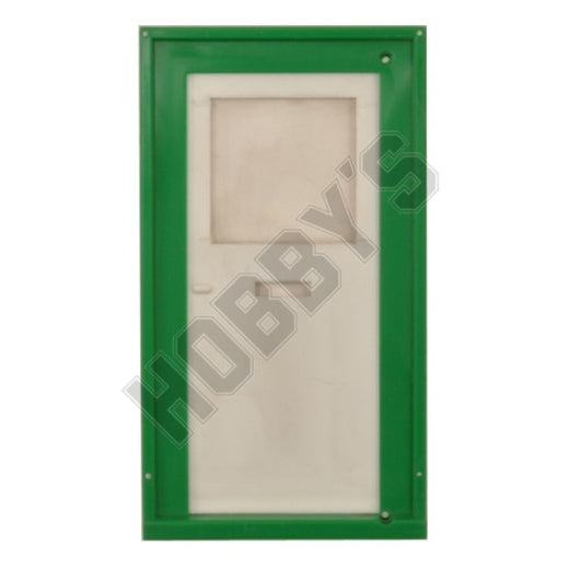 Glazed/opening modern plastic doll's house door (green and white with pin holes for fixing).