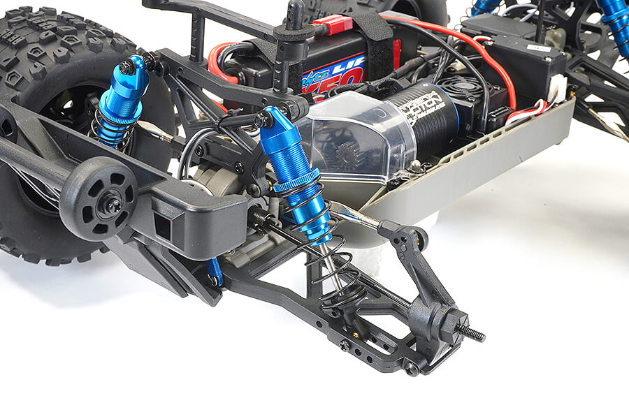 Oil filled aluminium shock absorbers along with a raised high clearance main chassis, with aluminium front and rear skid plates glide over most terrain effortlessly. Should you take a tumble, shock absorbing bumpers and moulded body roof and tail skid bar rails help protect from heavy damage when possible.