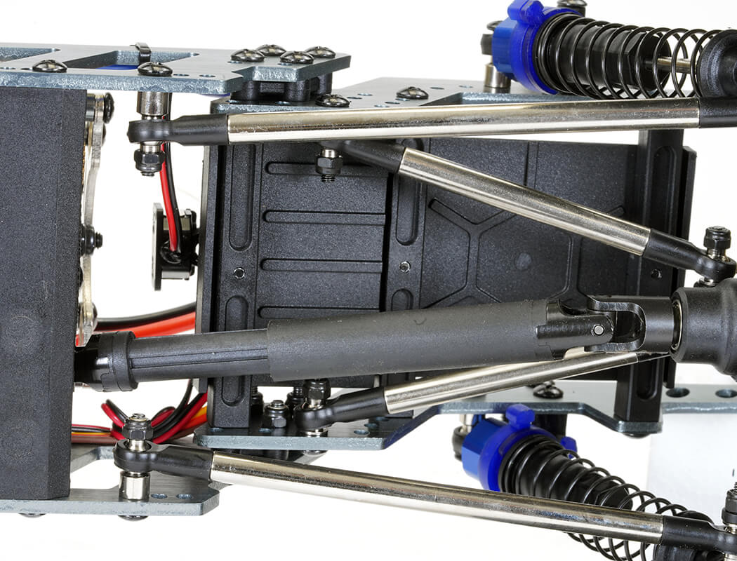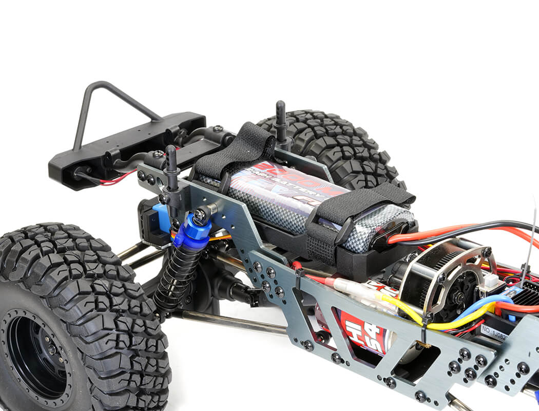 Tall 2.2”, high profile, super-size, and super-soft all terrain block tyres with memory foam provide fantastic traction and drive on the most testing of rocky surfaces. Now updated to an Etronix 15kg waterproof metal geared servo, the Mauler can navigate the harshest of terrain. The heavy-duty steel multi-link suspension provides exceptional articulation, which can be finely tuned via a series of mounting positions for the shock absorbers, links and chassis plates providing a multitude of angles and different wheelbases. Even battery and speed control can be relocated front or rear for custom tuning.