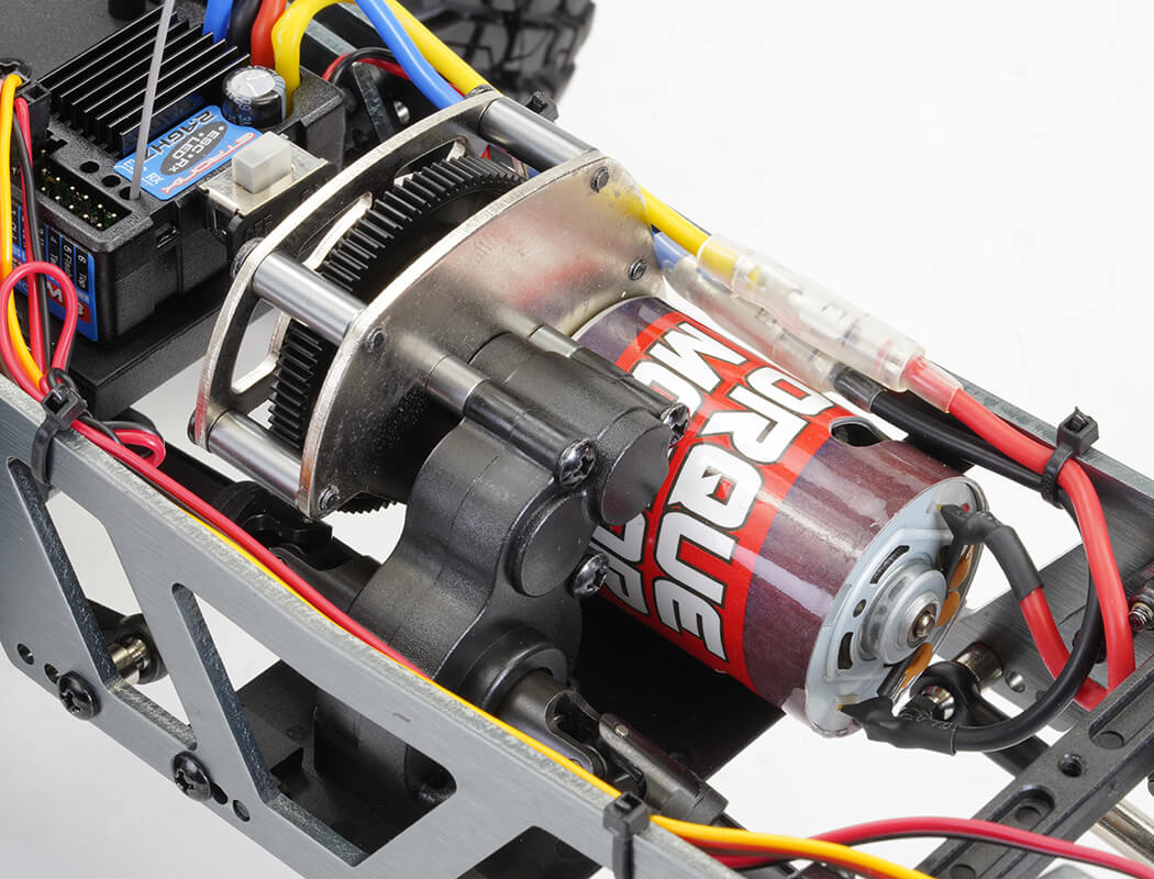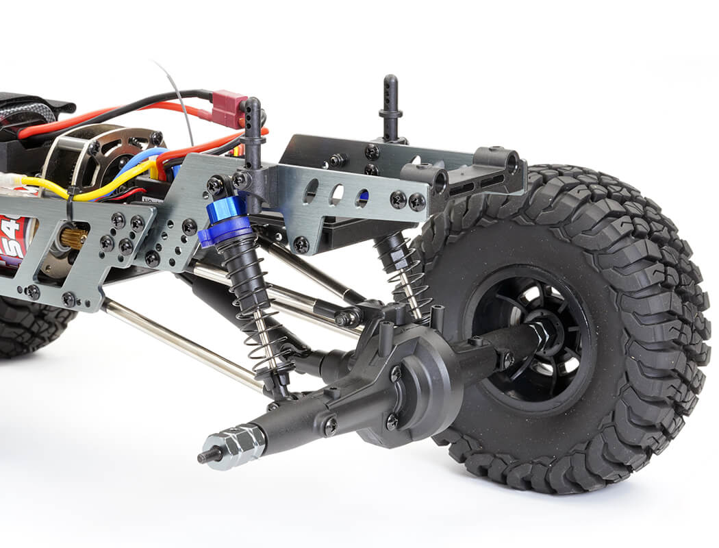 Updated now with the Etronix 4ch radio and System 3 waterproof ESC/ RX/LED intelligent light smart controller providing a wide array of different lighting options, along with plug-in bumper lights there is plenty of options for additional lights. Combined with the 4wd locked transmission and high torque gearing the combination provides super slow control when climbing or descending steep inclines.