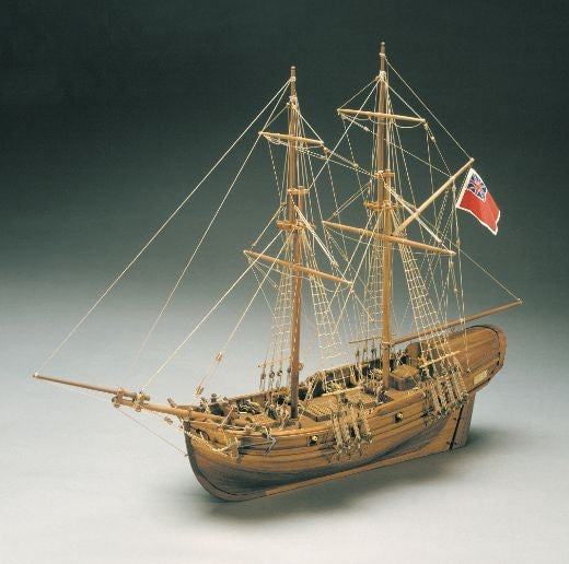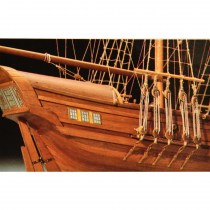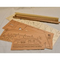 The kit features a plank on frame hull construction, building plans with general details, English instructions, lost wax brass castings walnut or lime planking, wooden masts and spars, brass and walnut fittings, etched brass details, rigging cord and silk flags. All sheet ply sections are laser cut for accuracy.