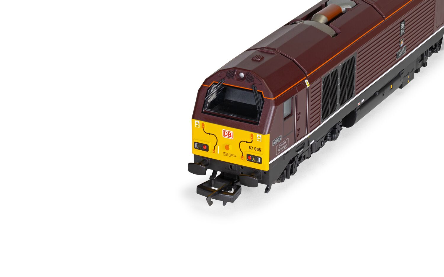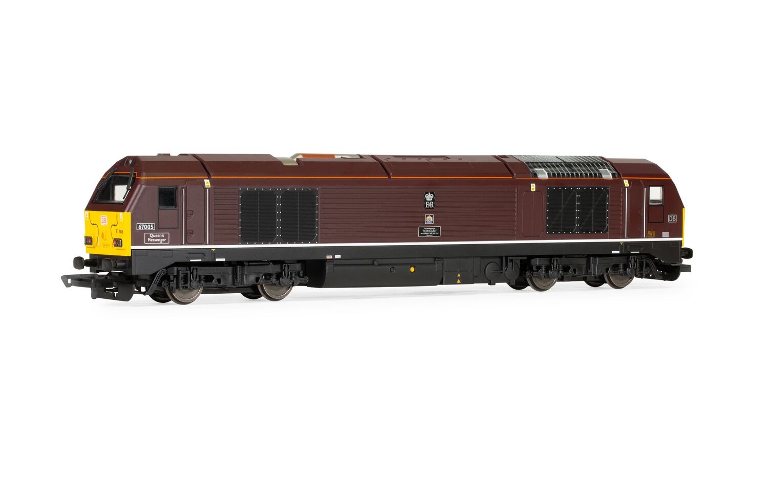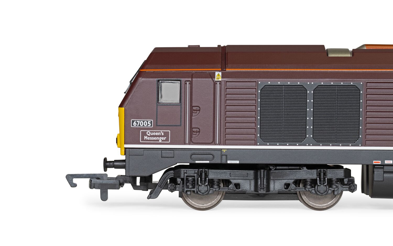 67005 is one locomotive assigned to the royal train, a service it has been responsible for since 2004. Initially in EWS maroon, the locomotive would later be named 'Queen's Messenger' 67005 is painted in the royal claret livery and operated by DB Schenker tasked with hauling members of the royal family around the UK.