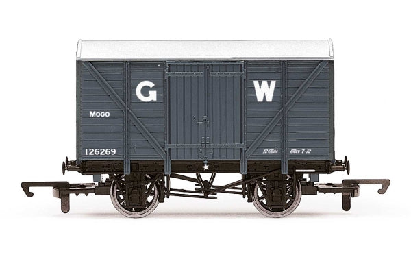 Mogo' vans were railway vans built by Great Western Railway (GWR) in-order to transport motor vehicles. Each van could only take a single vehicle which was loaded by driving through doors in the end of the van. The van additionally featured side doors so that it could be used to transport normal goods if not needed as a motor transporter. 350 wagons were built by GWR with the first appearing in 1933.