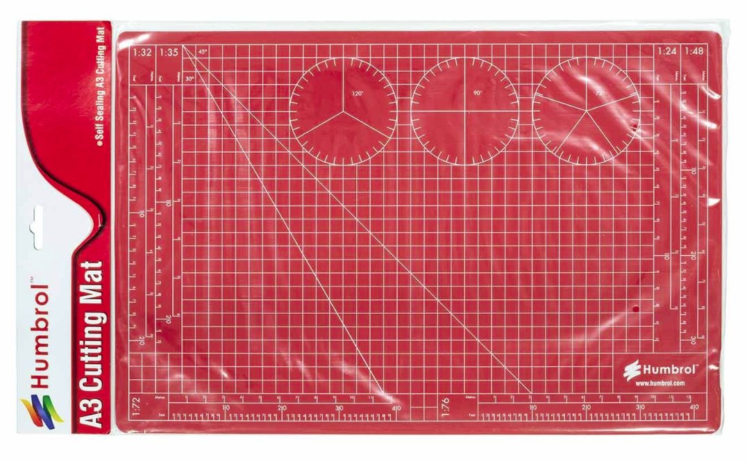 The A3 Cutting Mat is a double-sided self-sealing cutting mat with scale markings for 1:72, 1:76, 1:32, 1:48 and 1:24. Also features 1cm square grid pattern as well as 30, 45, 72, 90 and 120 degree angle markings (markings on one side only).