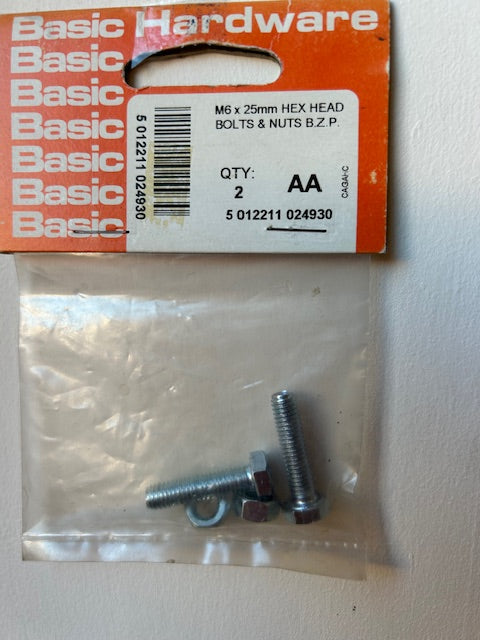 M6 x 25mm hex head bolts & nuts BZP x 2
