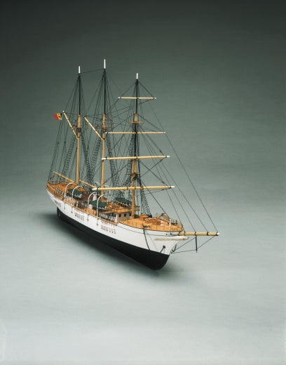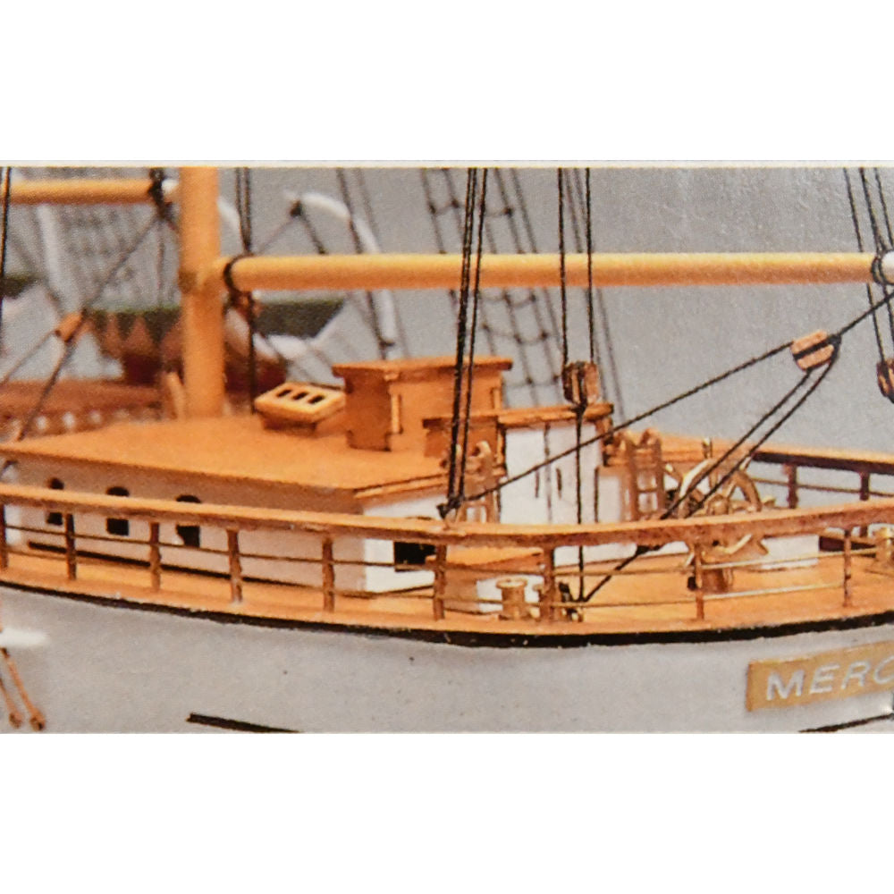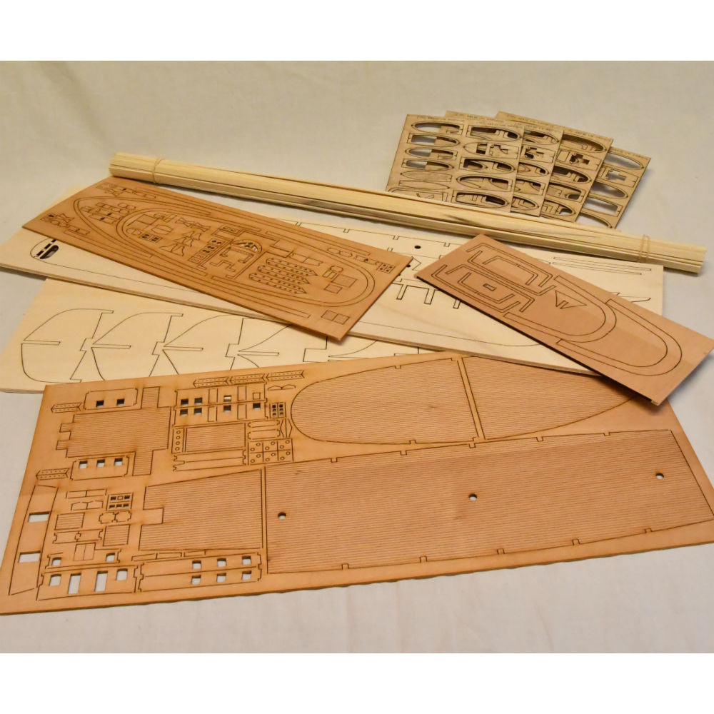 The kit features the following: A plank on frame hull construction, building plans with general details English instructions, lost wax brass castings walnut or lime planking, wooden masts and spars, brass and walnut fittings, etched brass details, rigging cord, and silk flag. All sheet ply sections are laser cut for accuracy.