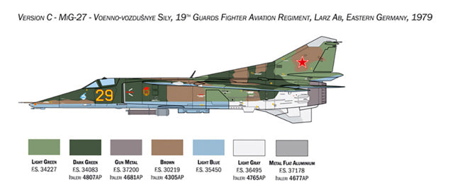 The variable-sweep fighter-bomber Mikoyan-Gurevich Mig-27 (NATO designation Flogger D), was developed by the Soviet aviation industry from the airframe of the Mig-23 fighter to make it more operationally effective, in both ground attack and close support roles. The aerodynamic layout was essentially that of the Mig-23 fighter but with a different nose configuration. To better meet the new role assigned to the aircraft, the on-board avionics were upgraded with new electronic counter measure systems and radar equipment for detecting, acquiring and ‘painting’ ground targets. The offensive armaments were further upgraded with the adoption of a new, more powerful 6-barrel 30 mm cannon than that of the Mig-23, and the option of carrying an offensive load up to 4,000kg, which included the new air-to-surface missiles.