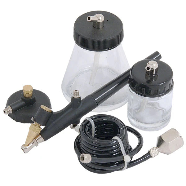 Air brush comes with 75ml jar with cover, 22 ml jar with cover, standard propellant regulator valve, 1.5 m air hose and Connector 1/4" (F) c 1/8" (M)