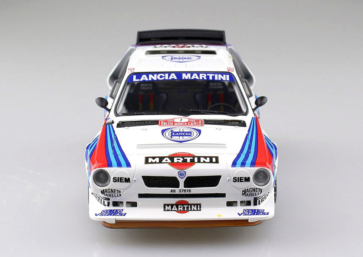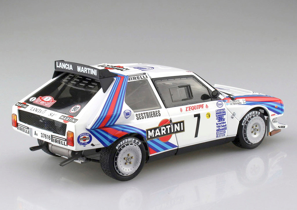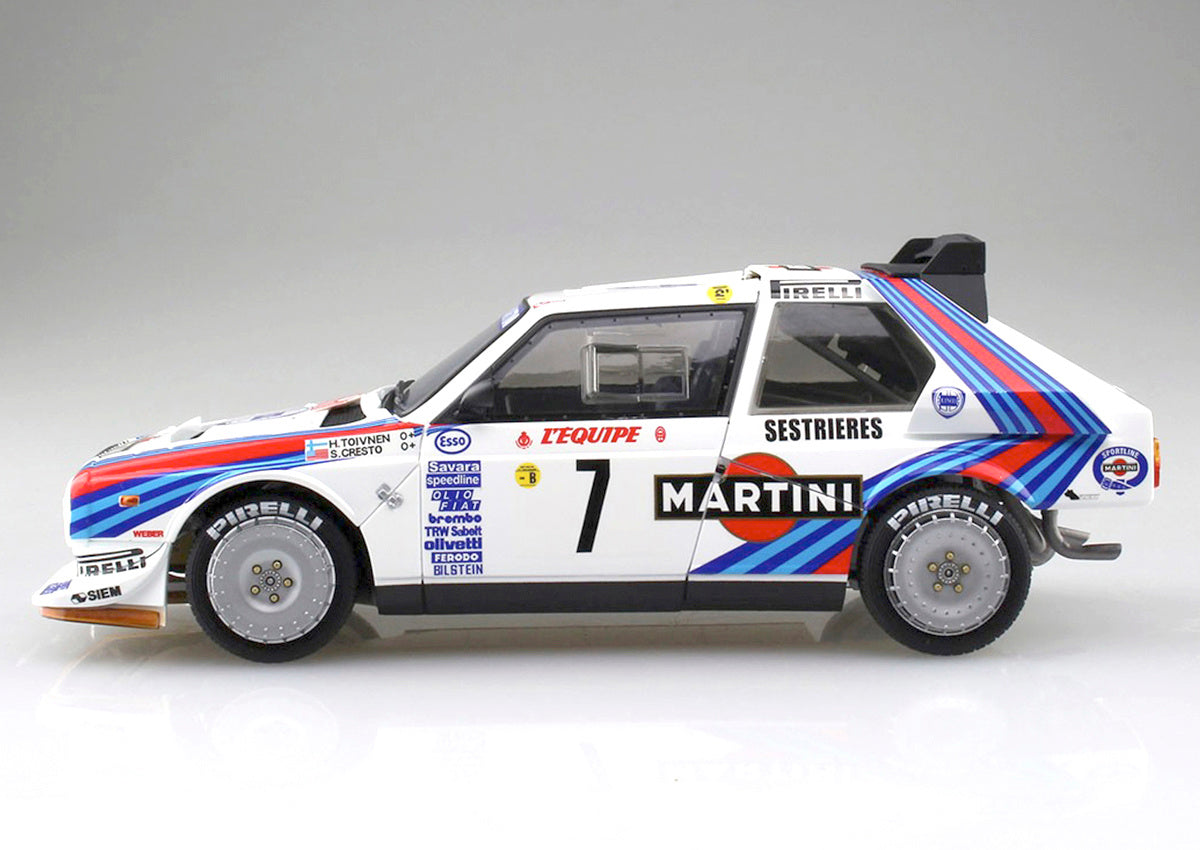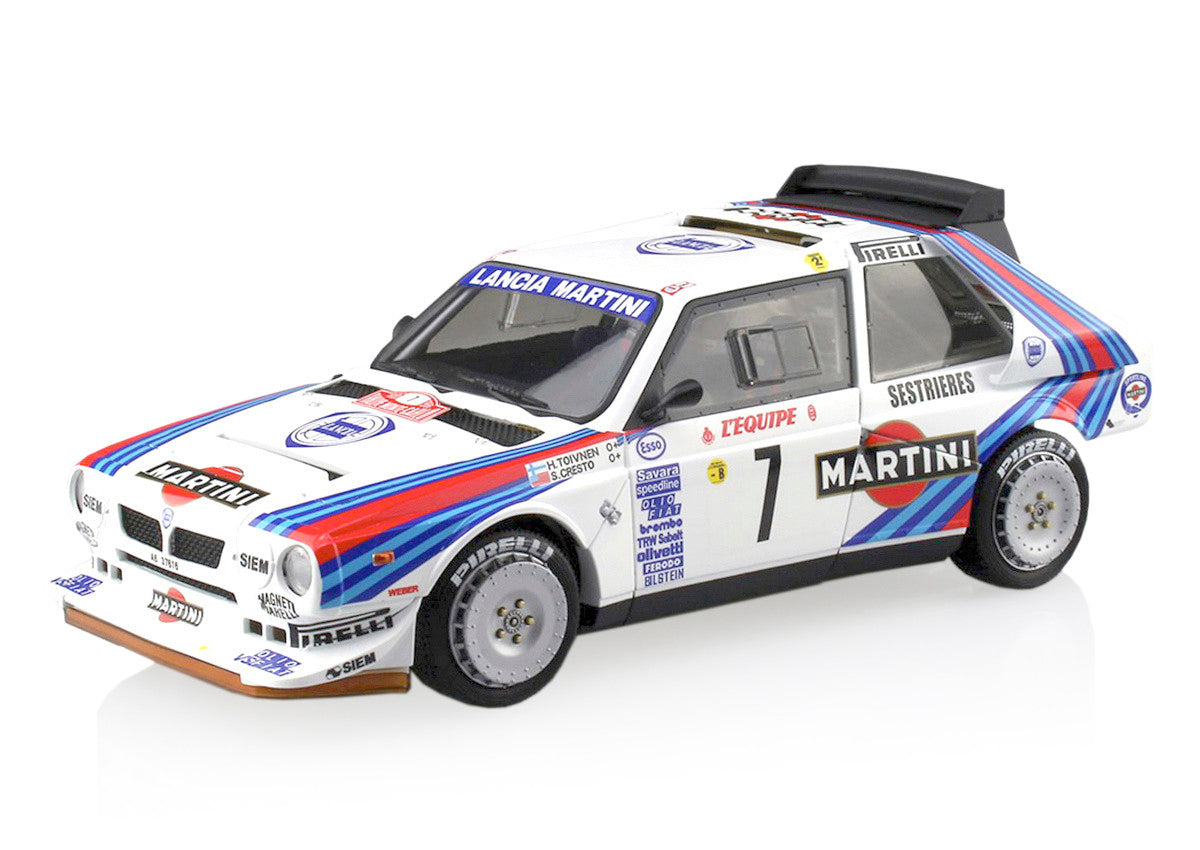 A 1:24 scale plastic assembly model kit of Lancia's iconic Delta S4 Group B rally car from the 1986 WRC season. It comes complete with decals to recreate the classic blue and red Martini livery, along with authentic sponsorship details and names for Finnish rally driver Henri Toivonen and American co-driver Sergio Cresto. The car had five wins out of twelve stages entered in the short-lived Group B WRC during the 1980s.