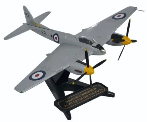 Deployed as TT197, part of 728 Naval Air Squadron based at Hal Far, Malta in 1953, it is decorated in silver with black cockpit interior and black military identification markings. The RAF roundel features on the upper and lower sides of the wings and along the fuselage. Additional components on the model include two fuel tanks, an arrestor hook, with the option of both a retracted and extended undercarriage. Note too, the yellow propeller tips and spinners and the black gun ports. Every detail covered, even down to the direction of the propeller blades!
