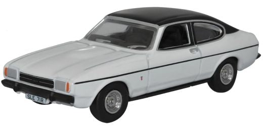 For its third appearance, our Capri Mk.2 is decorated in a stunning white colour scheme with black 'vinyl' roof and black external trim including black coachlines along the waist. The interior is also finished in black. Registered SLE 71R from 1976, additional external trim includes silver beading round the windows, silver door handles, wheel hubs and headlight surrounds.