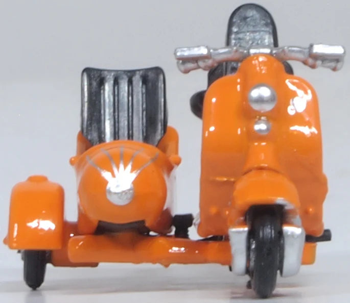 Decorated in bright orange, the front guard is also orange, the wheels are silver with white surrounds and the whole scooter is rounded off with chrome detailing. The pillion and sidecar passenger seats are moulded in black. The handle bars and brakes are also finished in chrome. Registered 525 UXE, the model dates back to the days before the new vehicle numbering system was introduced in 1962.