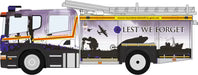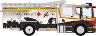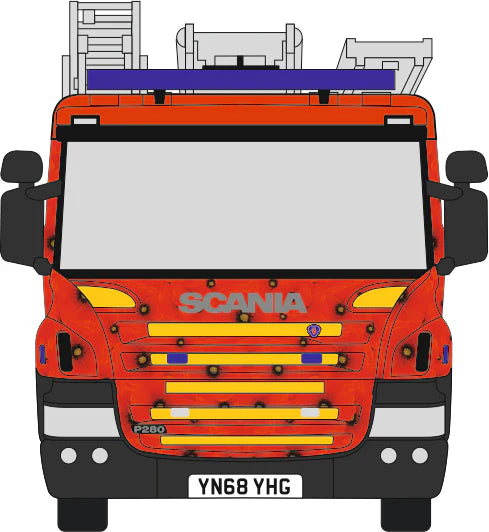 Our Oxford model is in 1:76 scale registered YN68 YHG. The red right hand drive Scania CP31 cab represents the largest in the Scania crew cab range and comprises an all-steel safety body which readily accommodates a six person crew plus generous storage for breathing apparatus and other safety equipment, all housed in a comfortable space. As well as the powerful graphics, the pump ladder fire appliance is completely ready for the day job with roof ladders, a blue light bar fixed to the roof along with a night owl mast lamp. The usual hi-vis chevrons decorate the rear behind the equipment while a bright yellow paint finish is applied to the front grille.