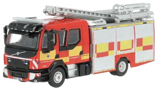 The Volvo F1 Emergency One Pump Ladder is as deployed by the South Wales Fire & Rescue and represents one of the latest fire appliances on the emergency scene. Our appliance is registered WX17 VWA and is decorated in bright yellow and red, with silver masking. Note the bi-lingual lettering on the crew cab doors and along the roof line. The impressive run of ladders stretches right along the roof as far as the roof light on the cabin, coloured silver. The crew cabin interior is all black.