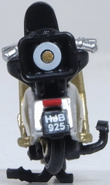 The colour scheme for Oxford’s fourth 1960s Scooter release certainly echoes the regal mood of the moment with its gleaming gold bodywork and red ,white and blue Union Flag emblazoned on the sides. Even the wheels are gold with white wall tyres. The curved number plate round the front mudguard reveals our scooter is registered HJB 925.Further detail includes a black seat with backrest, a gold and white spare tyre fixed behind, as well as silver trim to footplate, handlebars and headlight surrounds. It would certainly cut a dash even today, zipping through the traffic.