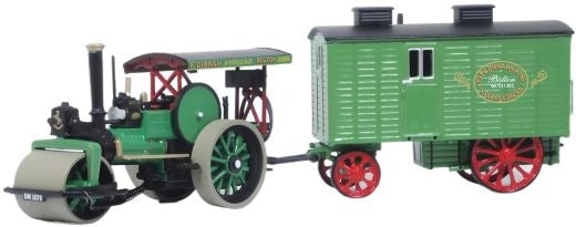 Fred’s Steam Roller is painted in bright green with a black roof, a clay brown roof underside and bright red features on the bodywork. His signage Fred Dibnah Steeplejack Bolton 30303 is printed in drop shadow work along the edge of the roof. As with all Oxford’s steam, vehicles, the detail is amazing with gold, silver, black, white, yellow and red used on cables, chains, struts, chimneys, belts and boiler to great effect. Fred’s steam roller is registered DM3079 and the Aveling & Porter crest sits proudly on the front of the black boiler. The road roller and wheel outers are given an olive grey finish while the roller and wheel inners are matt black. Fred named his machine Betsy and her name is printed in gold on black on both sides behind the tall black and gold chimney stack.