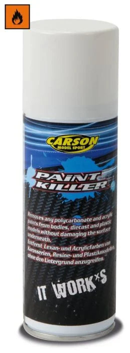The Carson Paint Killer removes Tamiya X, XF, AS, TS PC & PS lexan paint. Many other paint systems up to 2-component paint. Paint is removed without damaging the base material such as plastic, lexan, resin, metal or model glazing.