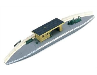 Detailed 'wooden' shelter with one straight platform section, two end ramp sections, fence and platform accessories.