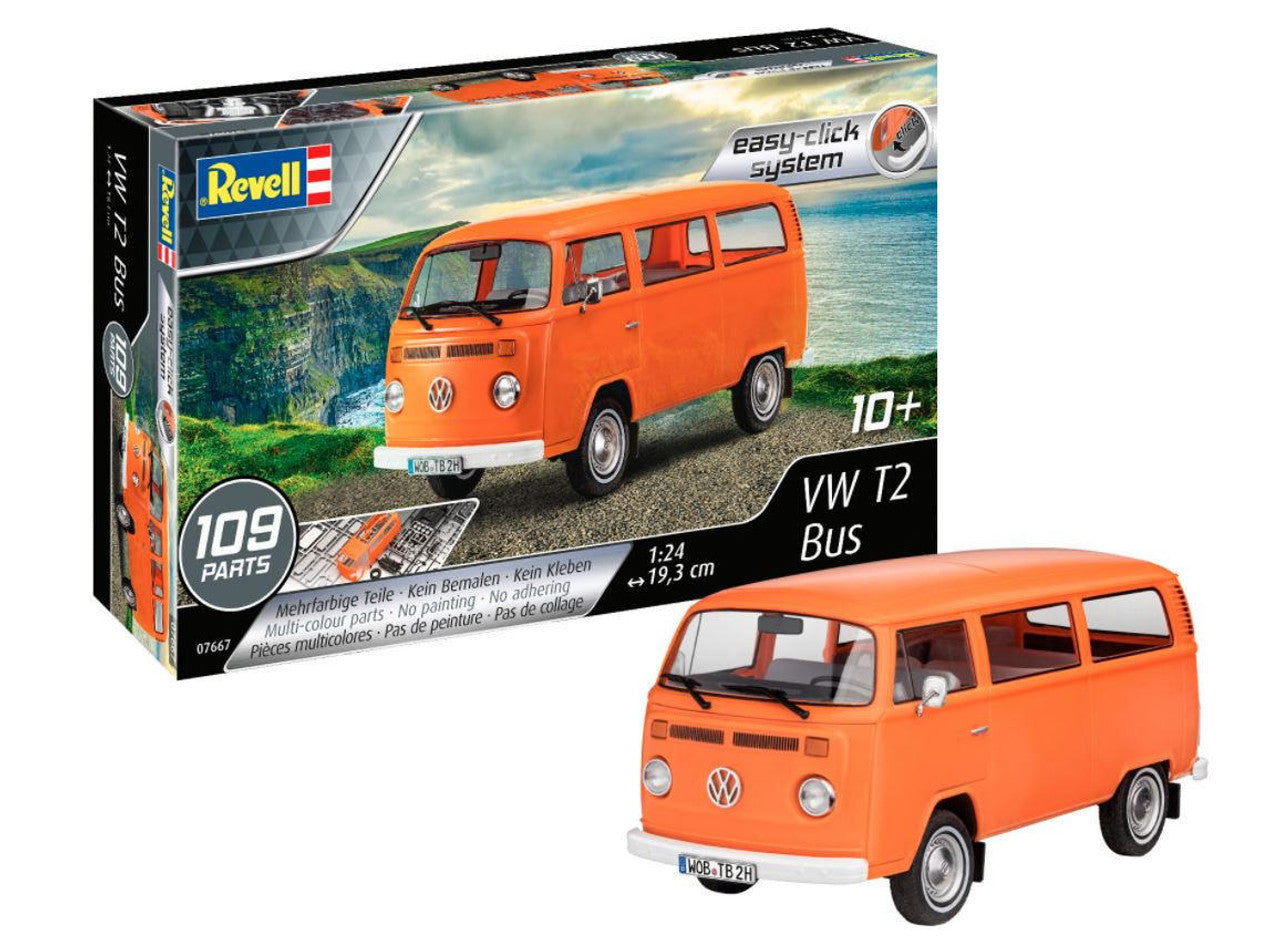 The Revell 1/24 Volkswagen T2 Bus Easy Click accurately recreates the real-life iconic micro bus. This plastic car kit does not require glue to complete so is perfect for younger modellers.