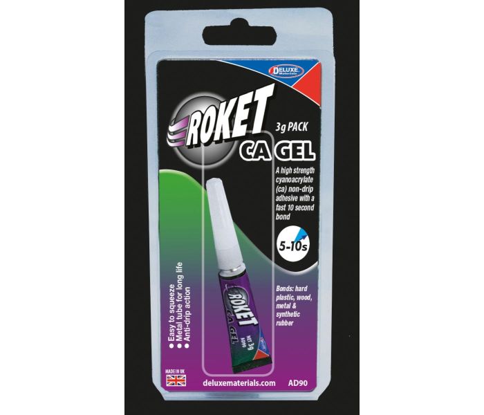Roket ca gel is a high strength cyanoacrylate (ca) non-drip adhesive with a fast 10 second bond. Fills gaps and bonds hard plastic, wood, metal and synthetic rubber.
