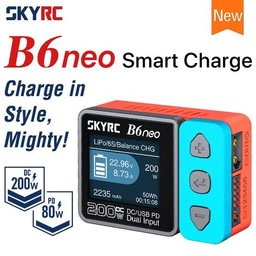 The SkyRC B6neo is a highly compact and powerful charger, equipped with dual DC and USB-PD inputs and an arm Cortex-M4 MCU, capable of delivering up to 200W of charging power. It features digital power supply functionality, versatile battery checking for a range of battery types, and smart fan control for efficient operation. Additionally, the B6neo offers an intuitive, multi-language interface and robust safety features, ensuring a reliable and user-friendly charging experience.