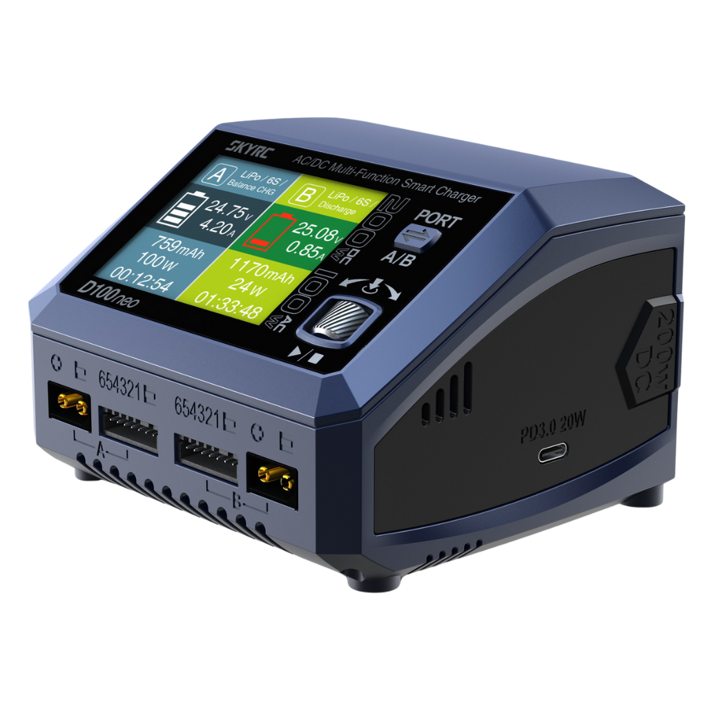 The SkyRC D100neo is a versatile dual-channel charger designed to meet the diverse needs of RC hobbyists. With two independent charging ports, it delivers a combined power output of up to 200W, allowing simultaneous charging of multiple battery types, including LiPo, LiFe, LiIon, LiHV, NiMH, NiCd and Pb. Its compact design, featuring a vibrant 2.8-inch colour display, ensures user-friendly operation and real-time monitoring of charging processes.