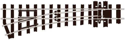 Small Radius Turnout. L/H Electrofrog, Nominal radius:304mm, Angle: 19.5 degrees, Length: 125mm. For narrow gauge models built to OO or HO running on 9mm gauge.