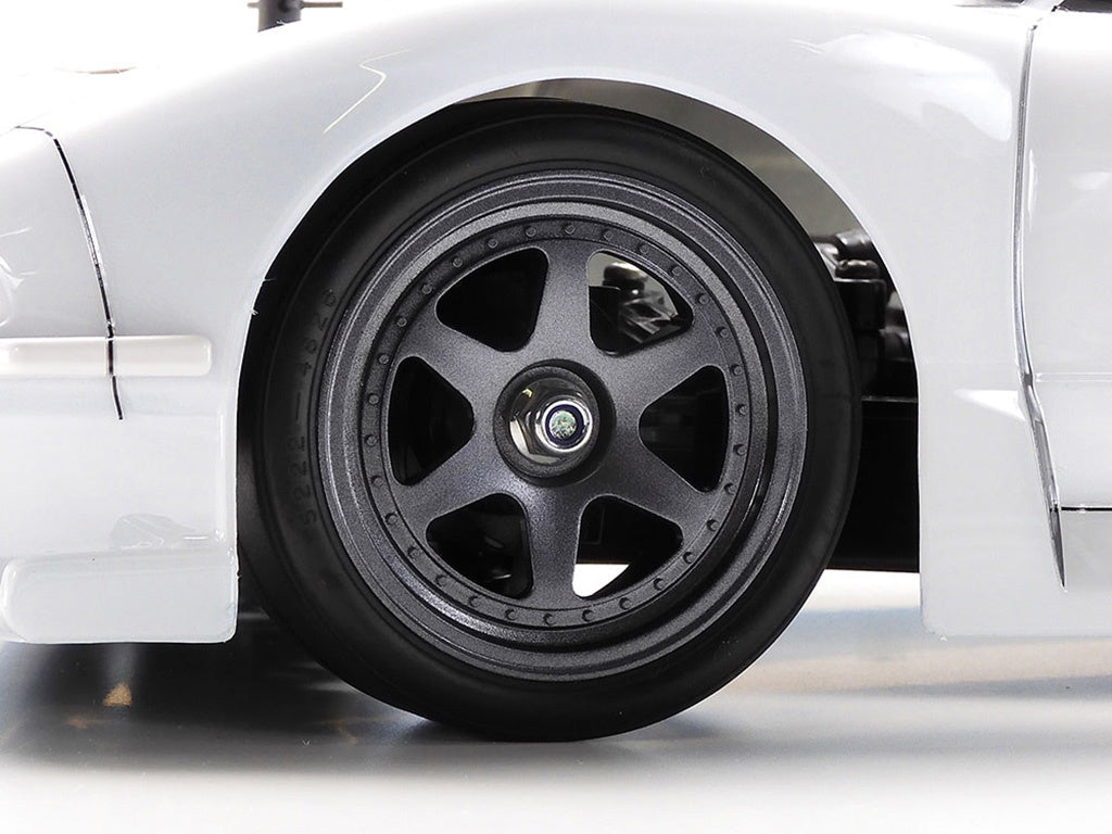 Gun metal 6-spoke wheels are paired with racing slick tires.