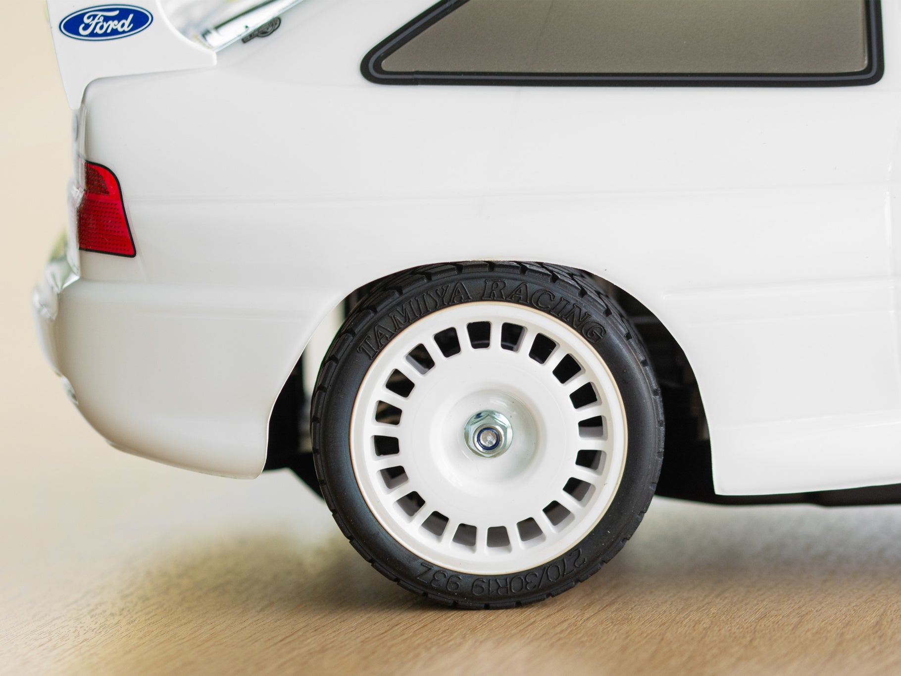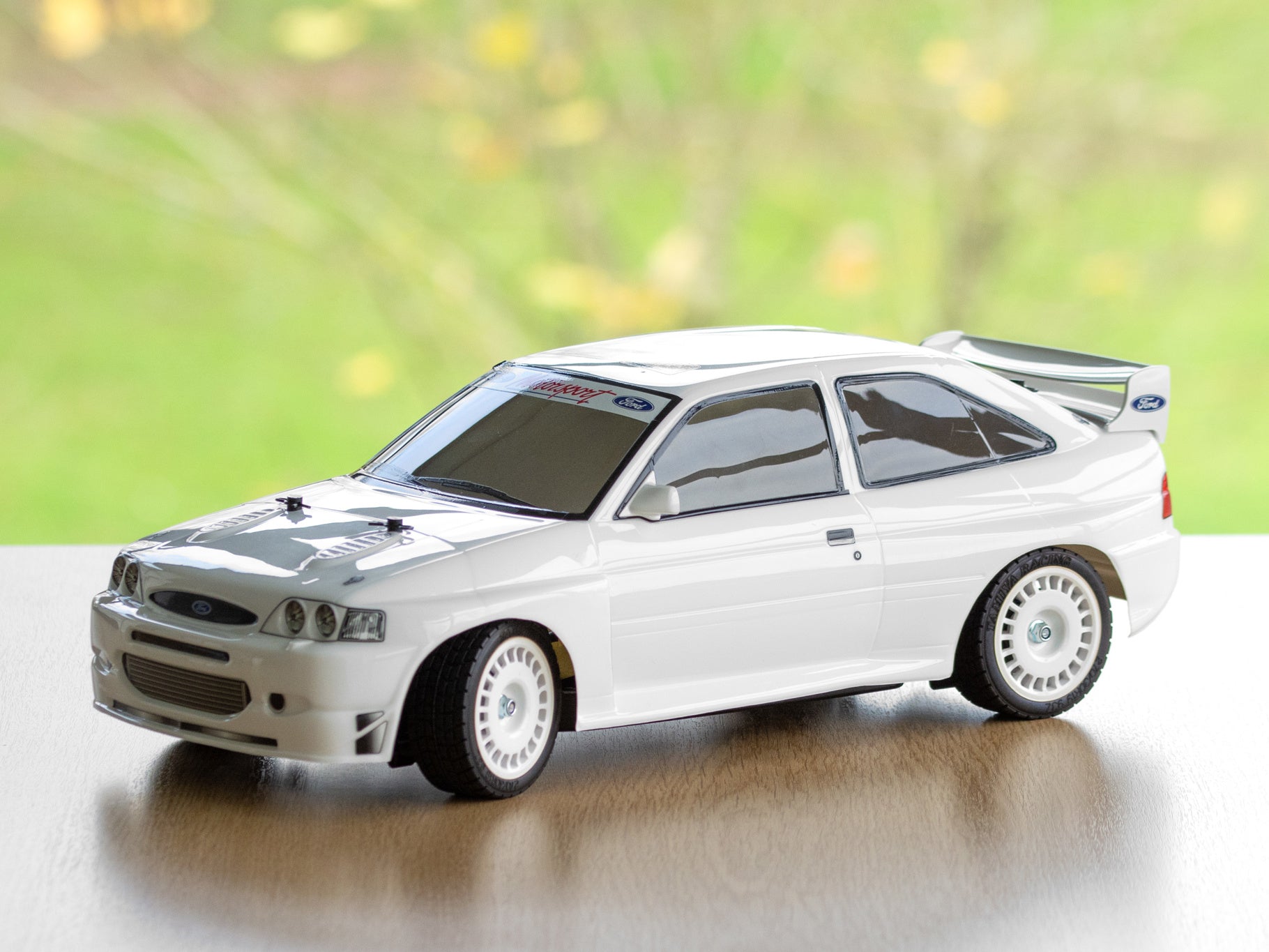 This R/C model assembly kit recreates a three-door hatchback Ford Escort Mk.6 with customisations such as blister bumpers, front spoiler and rear wing. The powerful form is captured by a lightweight and durable polycarbonate body, and stickers are included to add detail. The model is based upon the adaptable and user-friendly TT-02 chassis, which offers shaft-driven 4WD.
