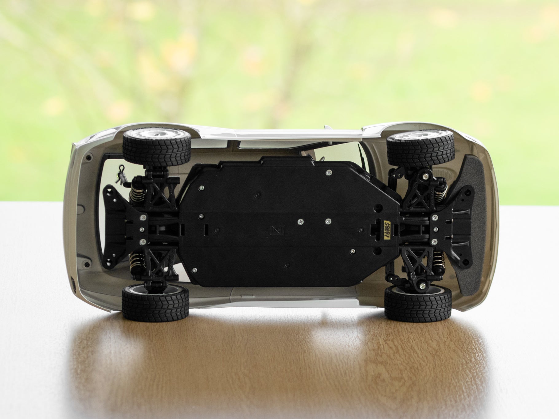 The shaft-driven 4WD TT-02 chassis employs a longitudinal layout with the battery on the left and the motor on the right, to give excellent stability. In addition, it features identical left and right suspension arms and uprights for ease of assembly, plus easy-to-maintain gearboxes. It is a highly adaptable chassis, as it offers 2 different wheelbases, 2 ground clearance settings and 2 tread set-ups in addition to a range of 10 possible gear ratios. It is not short on looks either, with brake disc-shaped wheel hubs and stylish front bumper supports. White dish wheels use tread patterned semi-pneumatic tyres.
