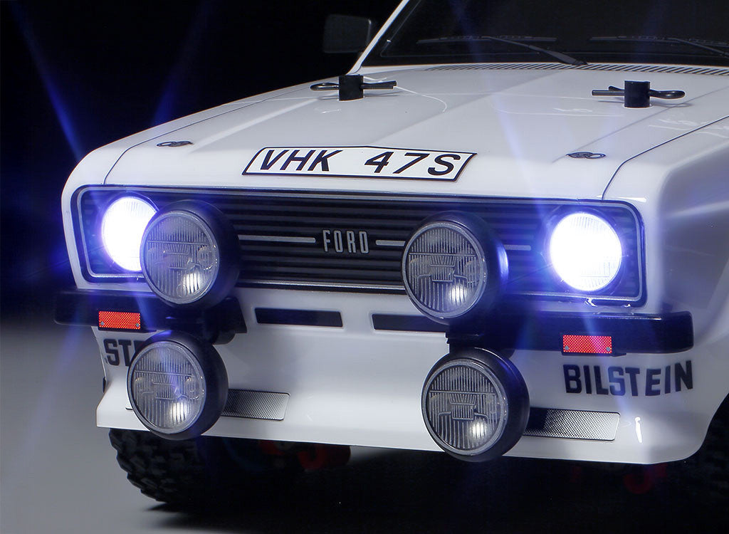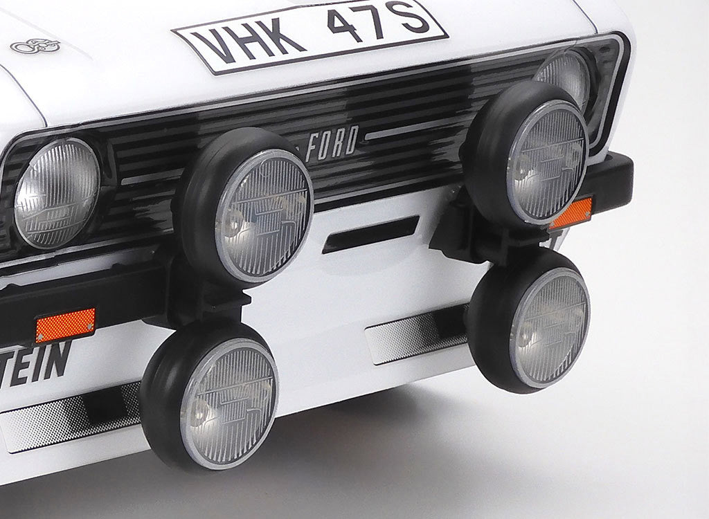 This R/C model assembly kit recreates the classic Ford Escort Mk.II in rally racing form. It was a RAC Rally Champion from 1975-1979. The pre-painted body sits on top the Tamiya MF-01X chassis that is capable both on asphalt and flat dirt surfaces.