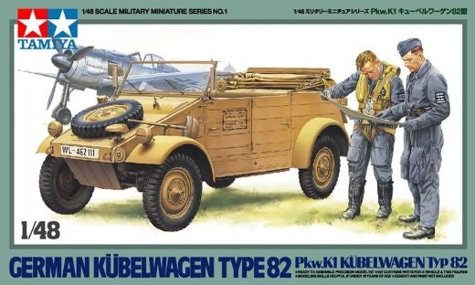 Plastic assembly kit of the German Kubelwagen Type 82. Overall length=79mm Perfect for people who want to create realistic dioramas with their 1/48 scale planes. Every characteristic of a late production Kubelwagen such as short rear fenders has been reproduced. The interior has been replicated down to the finest detail. Front doors come as separate parts and can be attached in opened or closed position. Set includes 2 figures in standing position, one holding a map and the other giving instructions just before flight.