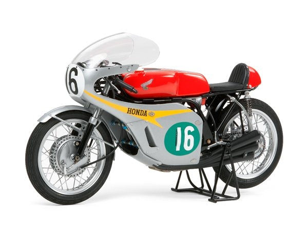 The Honda RC166 GP, the 250cc class machine famously won 10 out of 10 races during the 1966 GP road race season, featured a red fuel tank, silver font fender and body fairing, and black frame and exhaust.