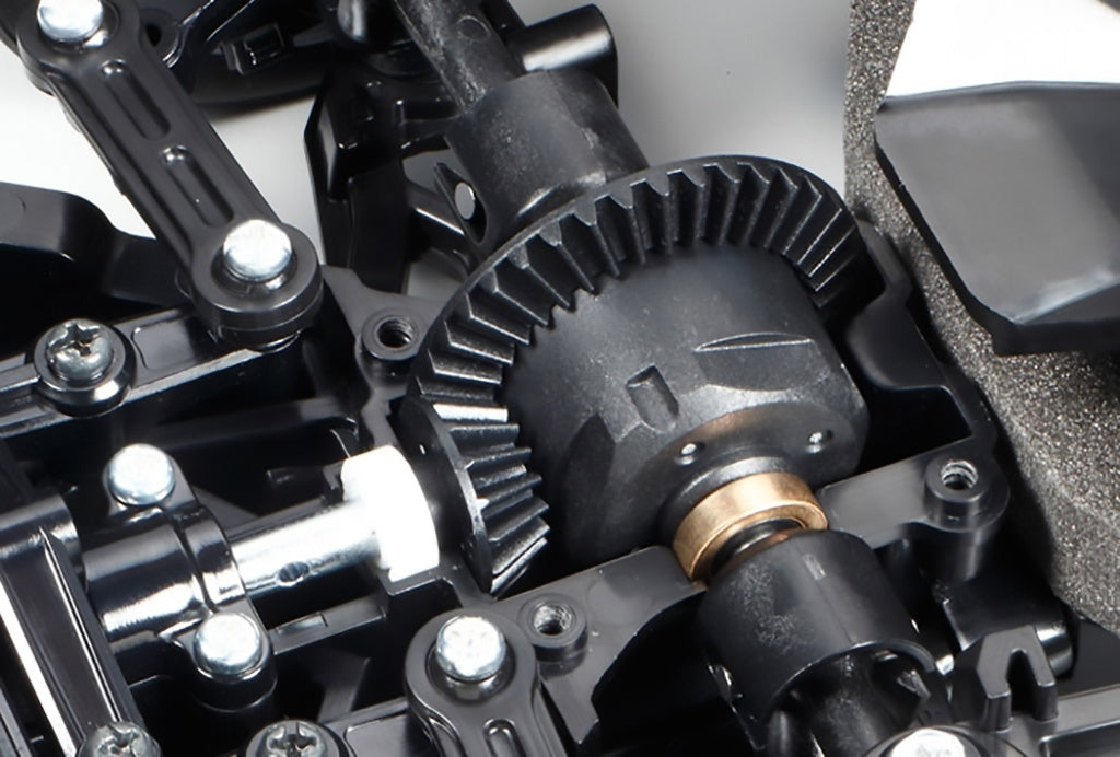 The shaft driven 4WD TT-02 chassis employs a longitudinal layout with the battery on the left and the motor on the right, to offer excellent stability. In addition, it features identical left and right suspension arms and uprights for ease of assembly, plus easy-to-maintain gearboxes. It is a highly adaptable chassis, as it offers 2 different wheelbases, 2 ground clearance settings (the higher position is used with the Lancia Delta Integrale) and 2 tread set-ups in addition to a range of 10 possible gear ratios. It is not short on looks either, with brake disc-shaped wheel hubs and stylish front bumper supports.