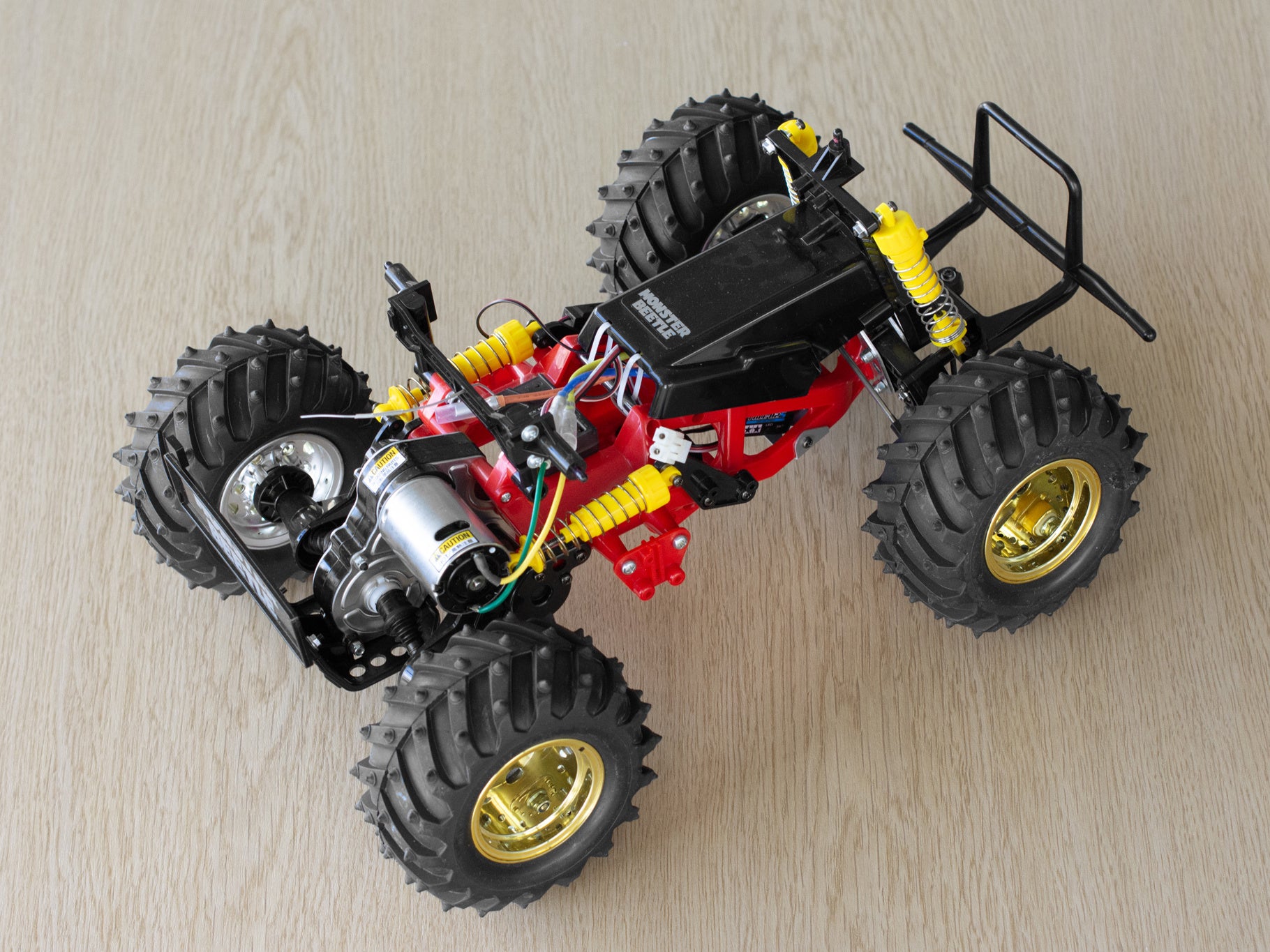 This hardy model's rear-wheel drive chassis is based around a durable ABS space frame to withstand all-action off-road driving. 4-wheel independent suspension uses CVA oil dampers, and has double wishbone front and trailing arm rear setups. Superlative cushioning and grip are provided by 130mm-diameter, 58mm-width lug pattern pin spike tyres on flashy gold colour plated wheels. Efficient and durable universal shafts come with rubber boots.