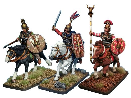Gallic cavalry were a significant mercenary element in Carthaginian armies throughout the Punic Wars, as well as fighting in all Gallic armies against the Romans, Carthaginians and Successors. They can also be used as Caesarian and Early Imperial Roman allies when fighting against the Germanic tribes. This set of Gallic cavalry are wearing armour to depict them as noble cavalry, an elite force within a Gallic army. Weapons include swords, spears and javelins plus a good variety of round shields. Parts are also included to create musicians and standard bearers plus we have provided optional cloaks. This set is fully supported by LBMS transfers.