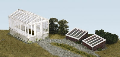 Green house and cold frames including glazing. Area of greenhouse 56 x 41mm, cold frames 26 x 25mm each.
